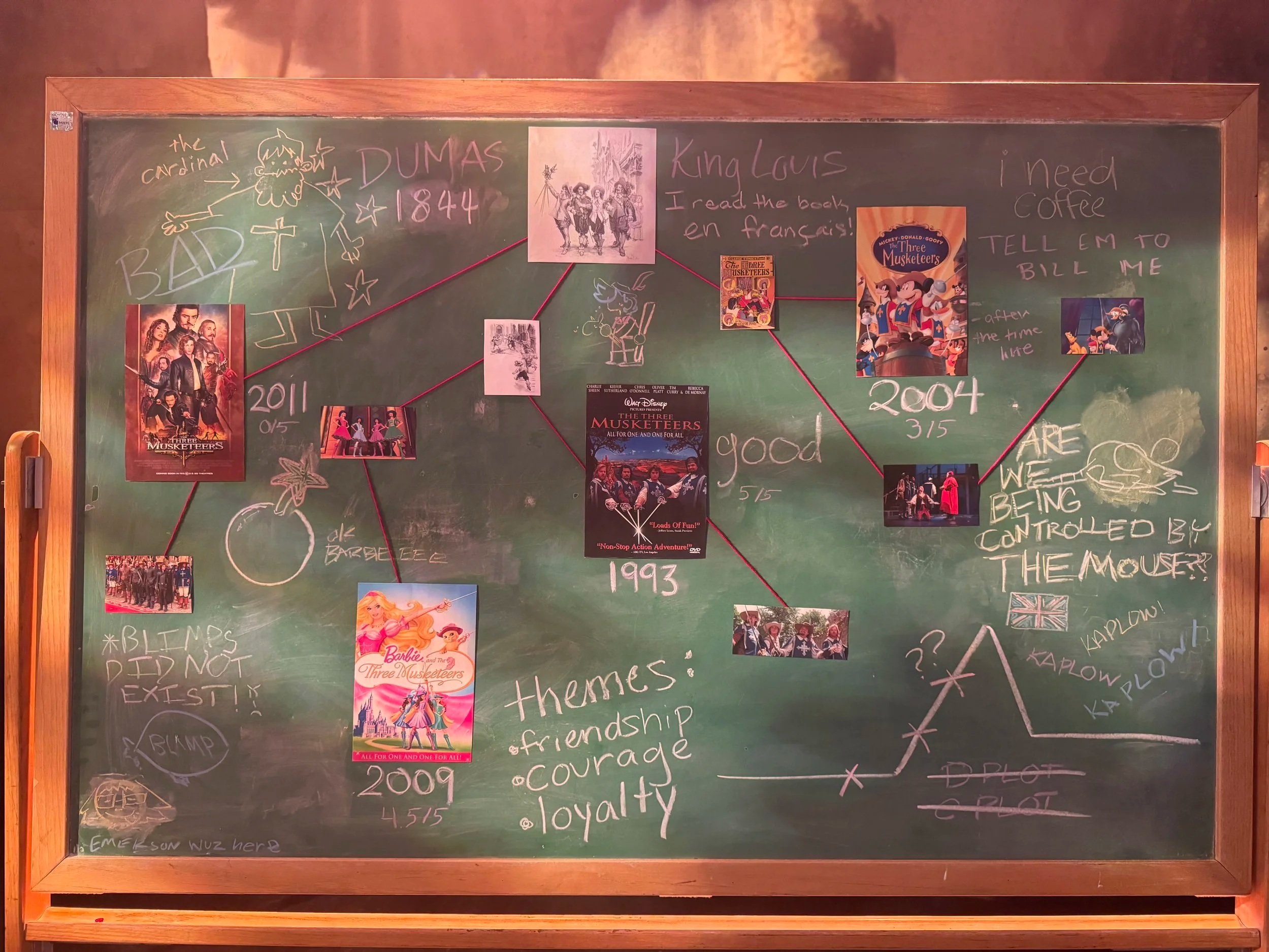 A set piece brought on by Kai towards the end of Act 1 where they point out the difference in film adaptations of The Three Musketeers compared to the original text by Dumas. Films mentioned in the script are the 1993 and 2011 version, the addition of Barbie and Disney were creative choices made by the dramaturgs and director. Additional doodles were done by few actors in the company.