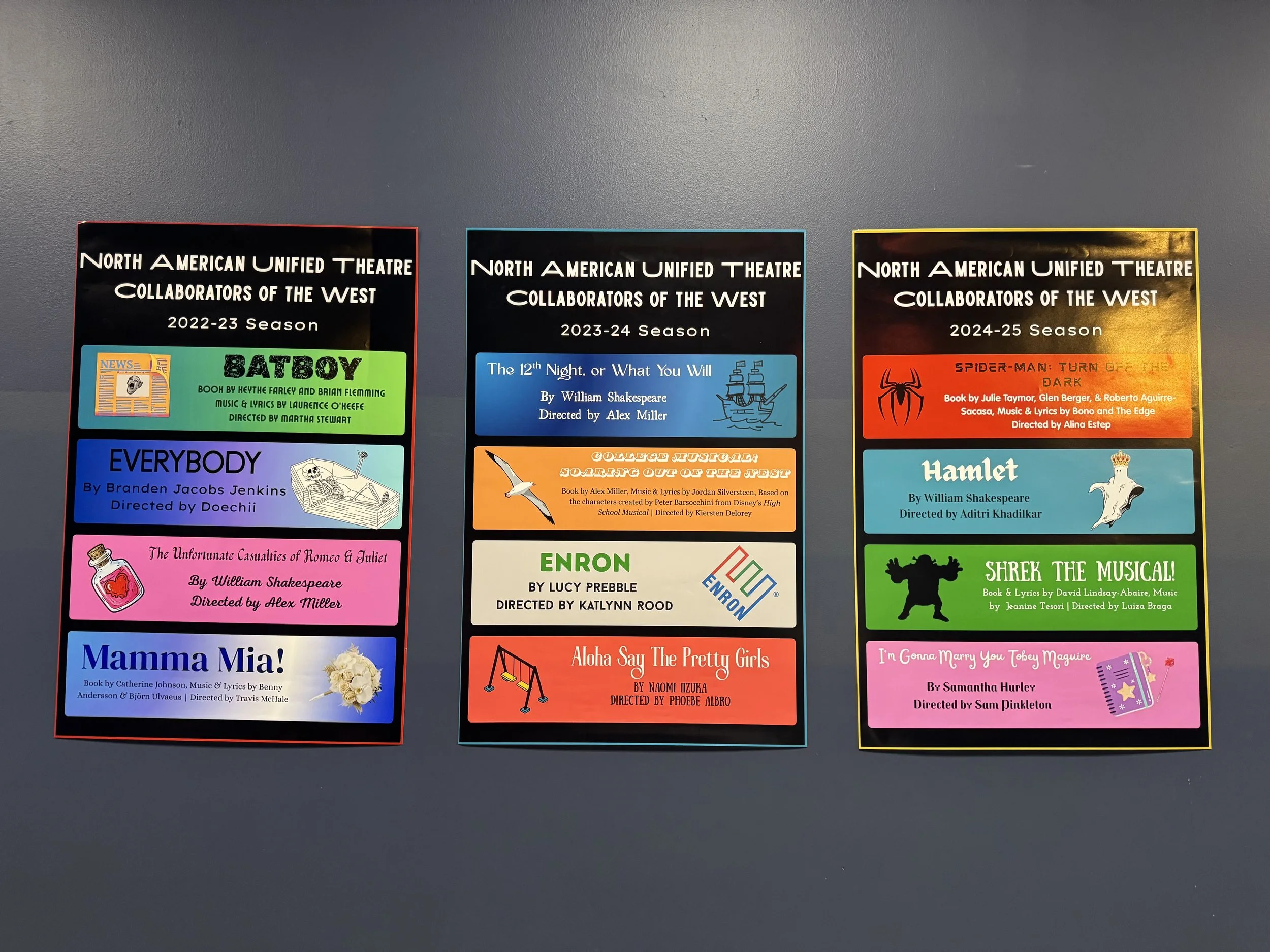 Opposite the call board was season posters of the North American Unified Theatre Collaborators of The West. These included some shows done at New Paltz in previous seasons.