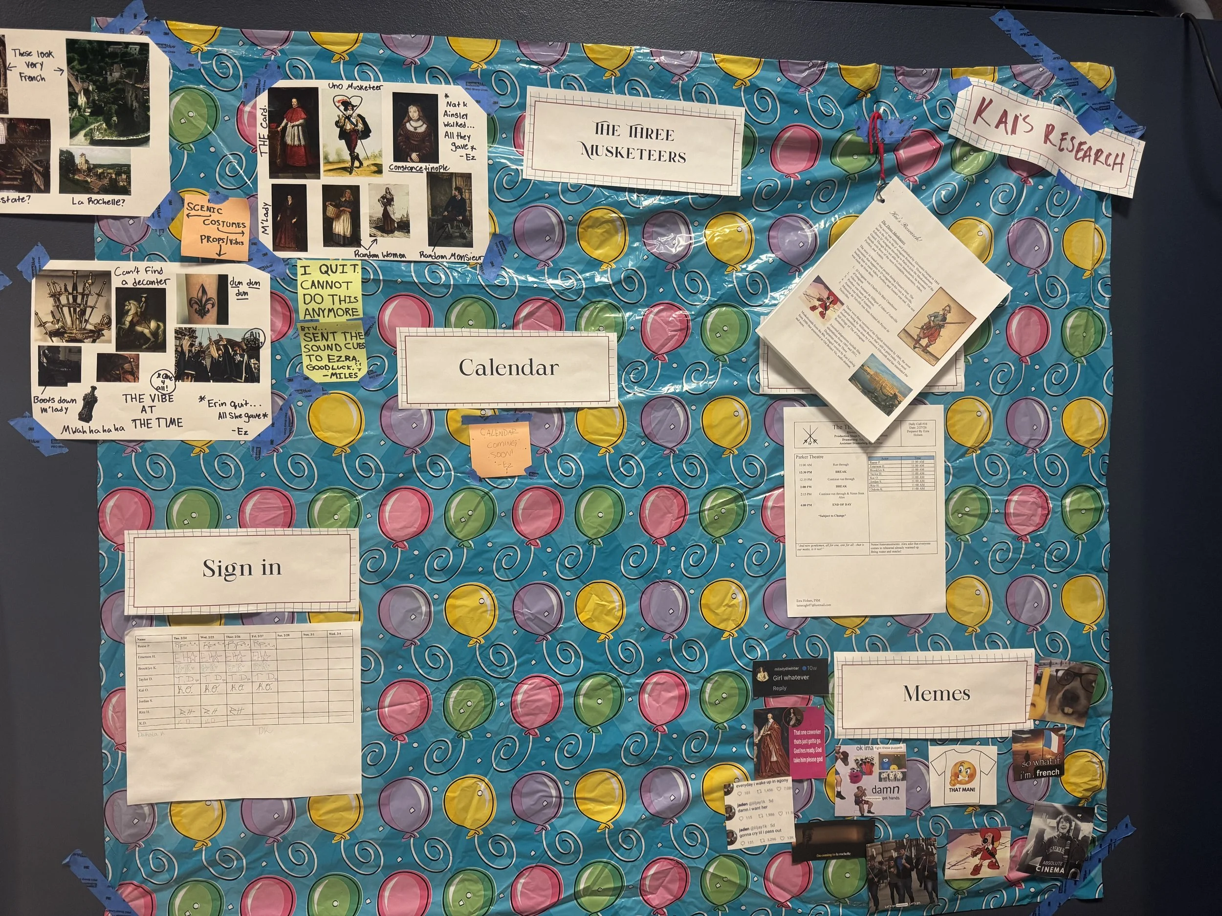 Lobby Display: A faux call board including a daily call, sign in sheet, memes, designer vision boards (made by the creative departments respectively), Kai’s research packet as an “actor’s packet”, and memes!
